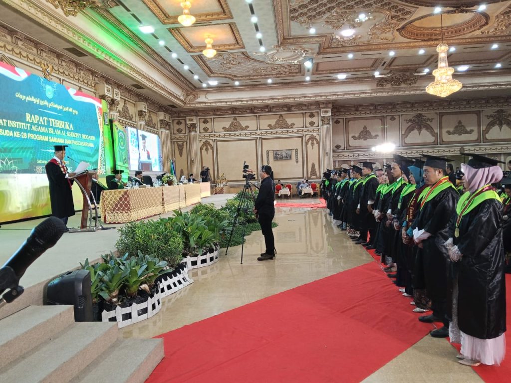 Inti acara, yakni pembacaan SK wisudawan, dipimpin oleh Wakil Rektor II, Drs. H. Mushodaq, M.Pd.I. Nama demi nama dipanggil, disambut langkah mantap para wisudawan menuju panggung. Mereka berasal dari berbagai program studi: Magister Pendidikan Agama Islam (PAI), Magister Manajemen Pendidikan Islam (MPI), Sarjana PAI, PIAUD, PGMI, Ekonomi Syariah, Ilmu Al-Qur’an dan Tafsir (IAT), Hukum Keluarga Islam (HKI), MPI, dan Komunikasi dan Penyiaran Islam (KPI).